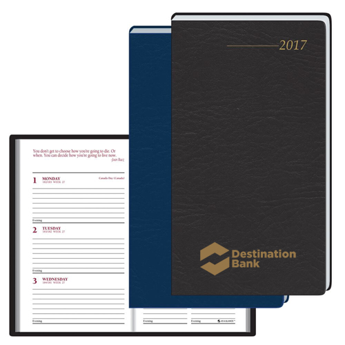 - Each week displayed over 2 pages; each spread includes a thought-provoking quote in upper corner and two mini monthly calendar blocks